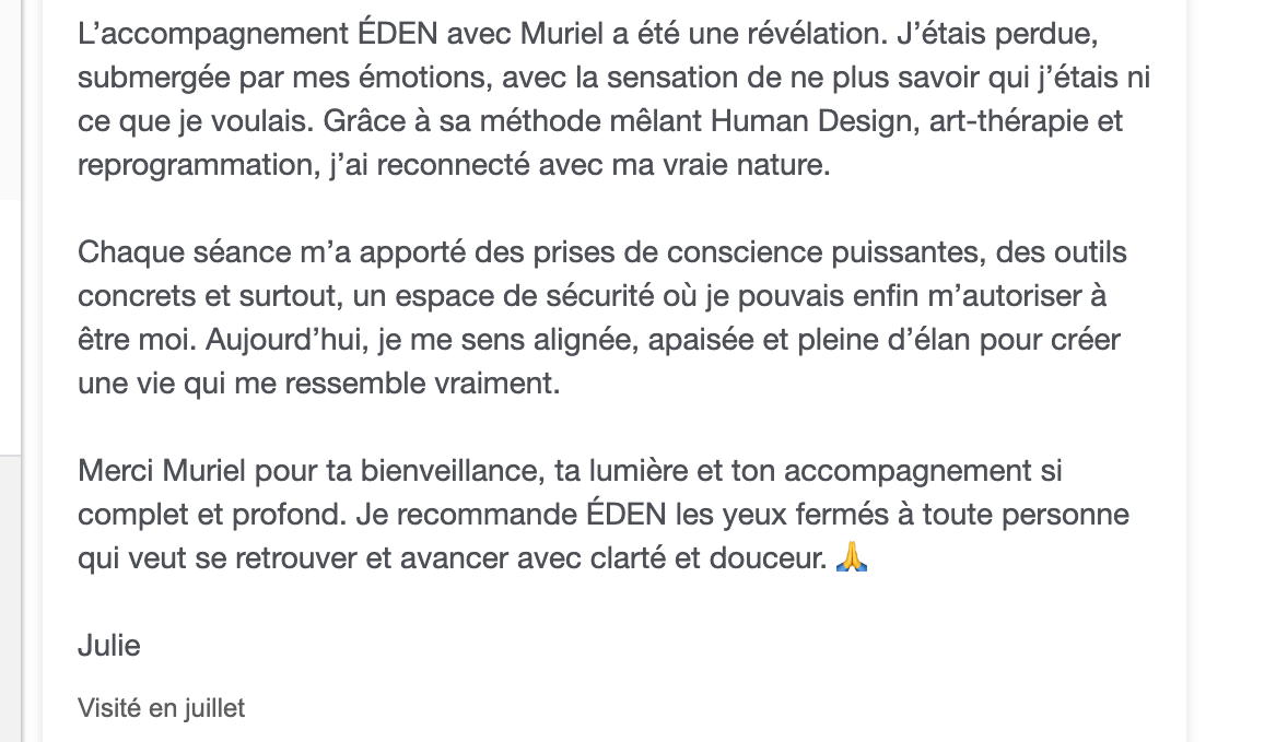 Les outils utilisés (Human Design, art-thérapie, reprogrammation, coaching intuitif...) ont permis à des centaines de mes clients de se libérer de schémas répétitifs, de se recentrer et de retrouver une vraie clarté. Le centre Éden utilise des techniques éprouvées comme l’intelligence émotionnelle et l’art-thérapie, qui ont montré leur efficacité dans de nombreuses études scientifiques. Je suis moi-même passée par des défis similaires et j'ai vu de nombreux clients réussir grâce à ces approches.
