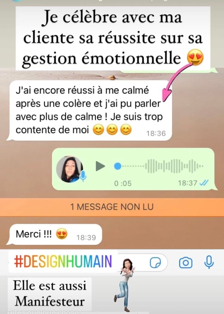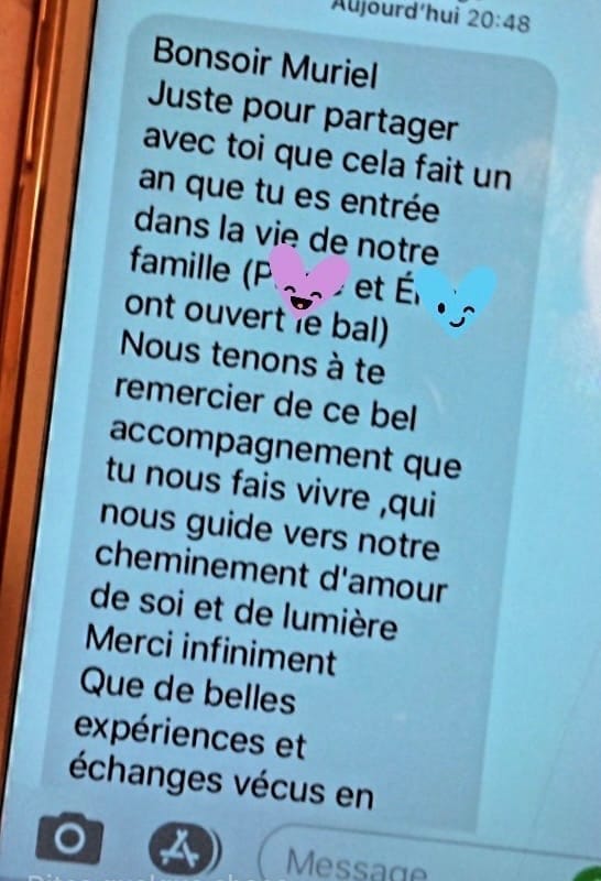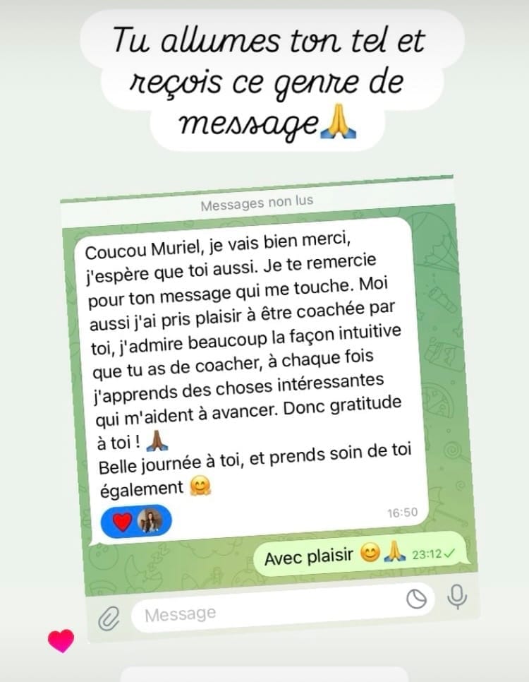 Le suivi WhatsApp te permet de rester accompagnée entre les séances. Tu peux m’envoyer tes questions, tes prises de conscience, tes difficultés ou tes avancées.